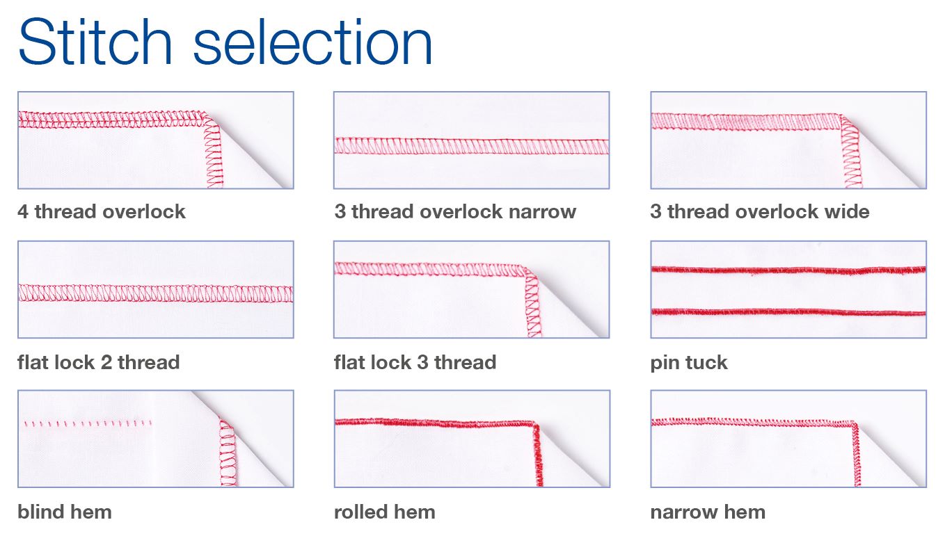 The 4234D lets you sew all of the following stitches: 4 thread overlock, 3 thread overlock narrow, 3 thread overlock wide, flat lock 2 thread, flat lock 3 thread, pin tuck, blind hem, rolled hem and narrow hem.